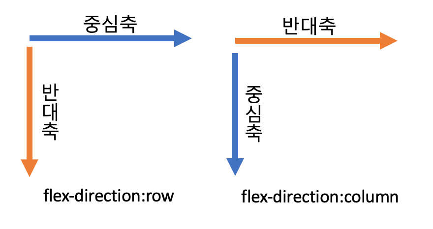 flxe-direction을 row 로 할 경우 중심축은 수평선 (파랑색) 이며 되며 반대축은 수직선이 된다.